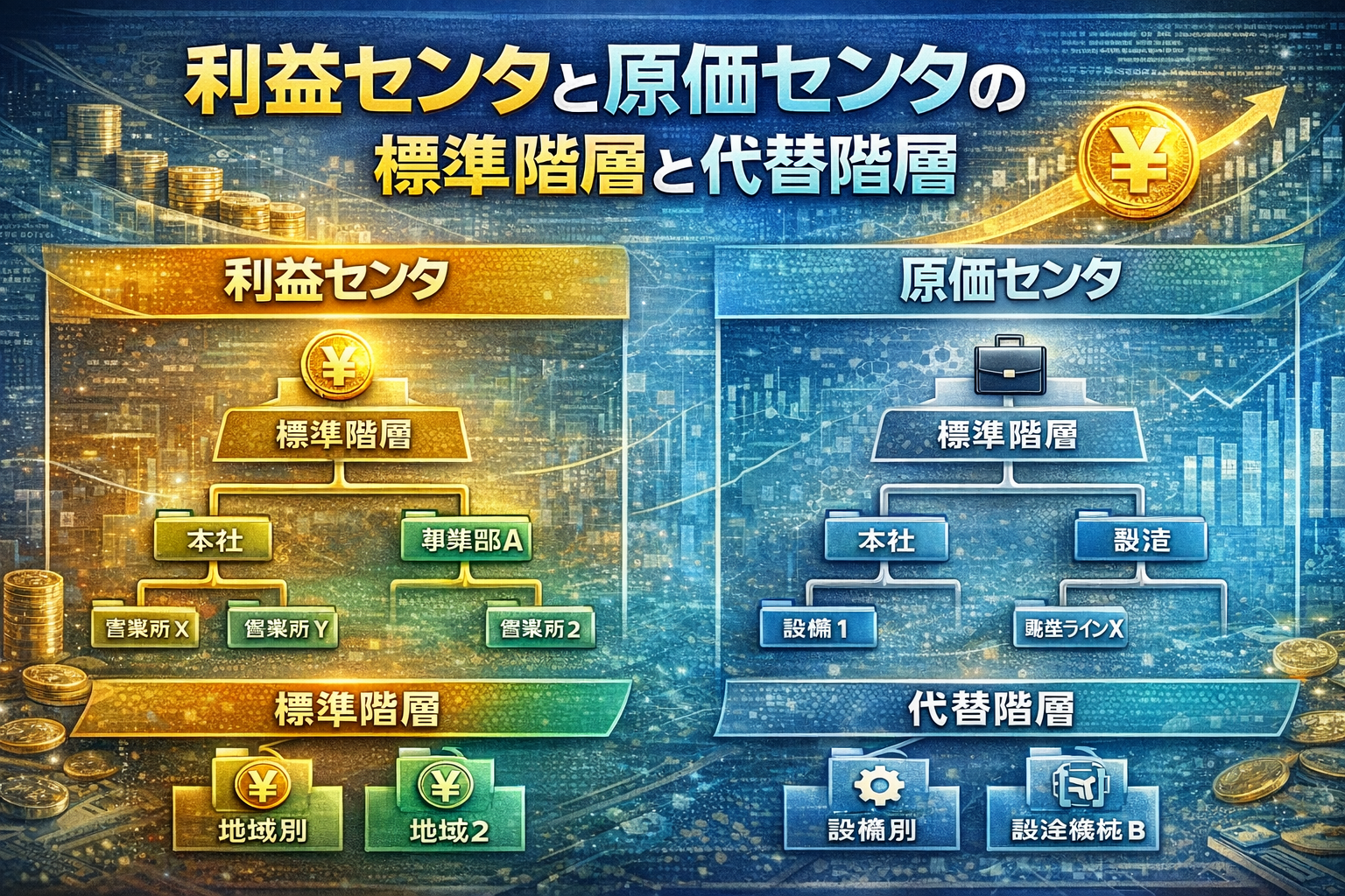 レポート目的や配賦目的などのために、原価センタグループや利益センタグループを登録することがありますが、標準階層以外の原価センタグループや利益センタグループを代替階層と呼びます。