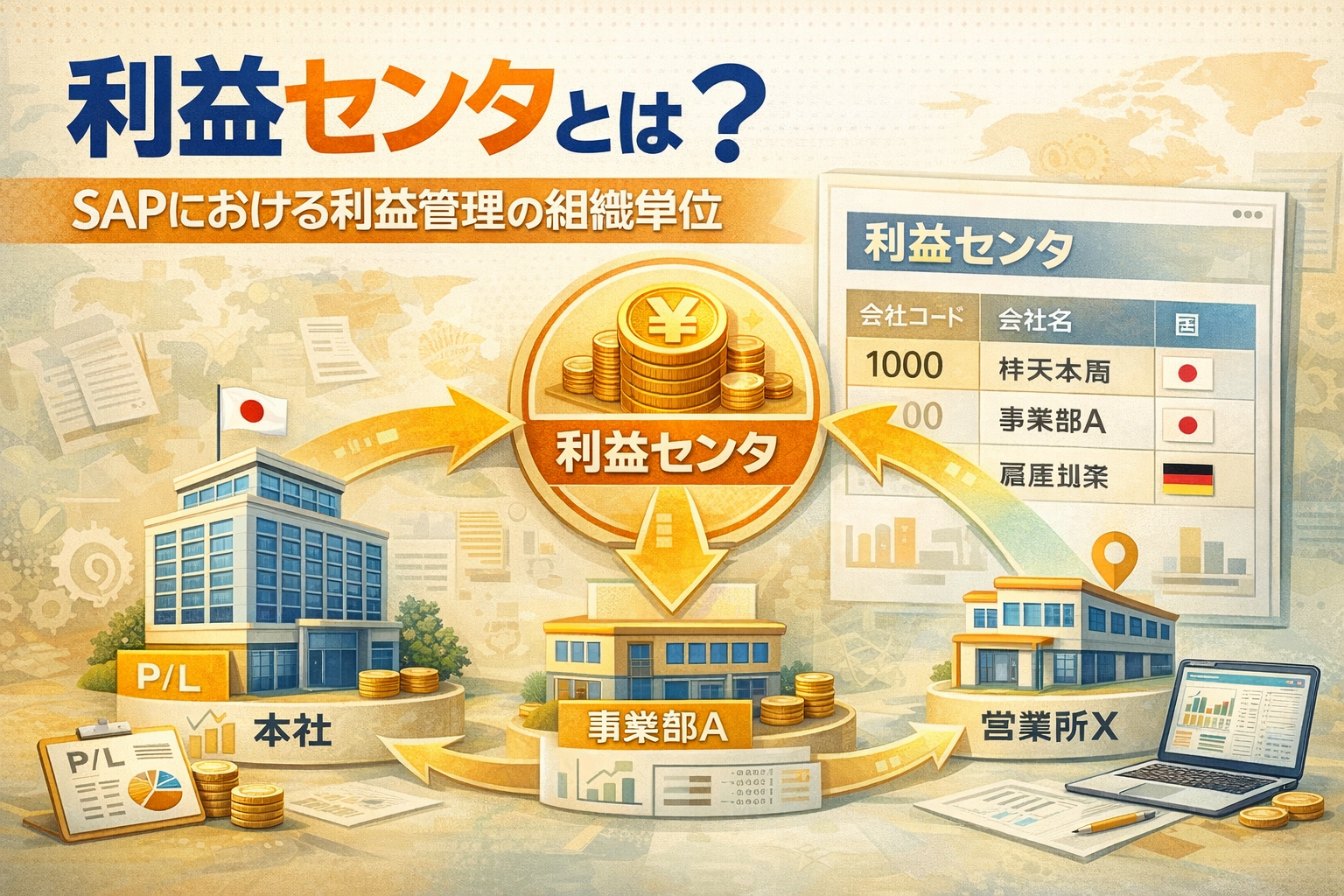 一般的には、部署や課、拠点などの単位で利益センタのコードを採番し、収益と費用のデータを利益センタの単位で集計出来るというような仕組みになっています。具体的には、会計伝票の収益明細・費用明細に対して利益センタを設定し、それを集計することで、その差額の利益が把握できる仕組みになっています。